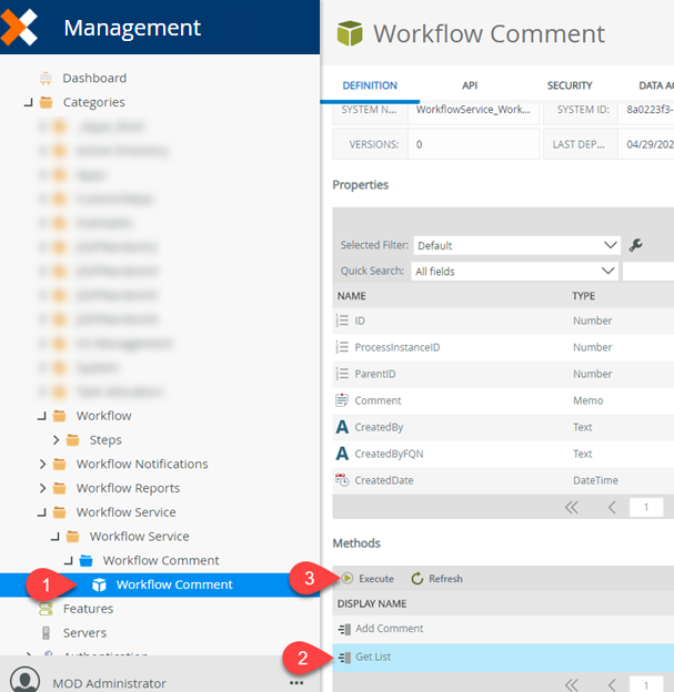 - Navigate to the Workflow Comments SmartObject, located in Workflow Service > Workflow Service > Workflow Comment and Execute the Get List method. Enter the value of the Process Instance ID that you made a note of the previous step.