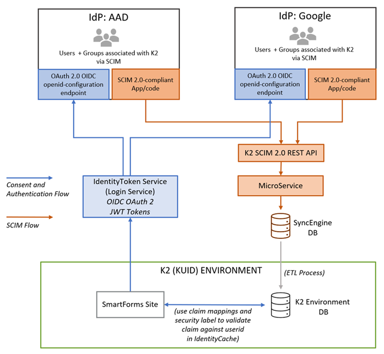 Essentially, there are two 'flows' that enable Identity Providers in Nintex Automation K2: a SCIM-based flow that allows you to pass user identities from an Identity Provider (IdP) to the product, and an OAuth-based OpenID flow that allows the product to authenticate users against an Identity Provider. The diagram below illustrates the basic architecture of these flows. In the diagram, notice two different colors: the orange flow represents the SCIM flow where the Identity Provider sends user information to the product, and the blue flow represents the authentication flow when users are authenticated against the Identity Provider when they log into the product.