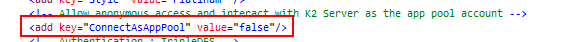 - Set appSetting ConnectAsAppPool to "true". This setting can be found in the web.config file of the runtime virtual directory in the IIS K2 Site. The location is by default: