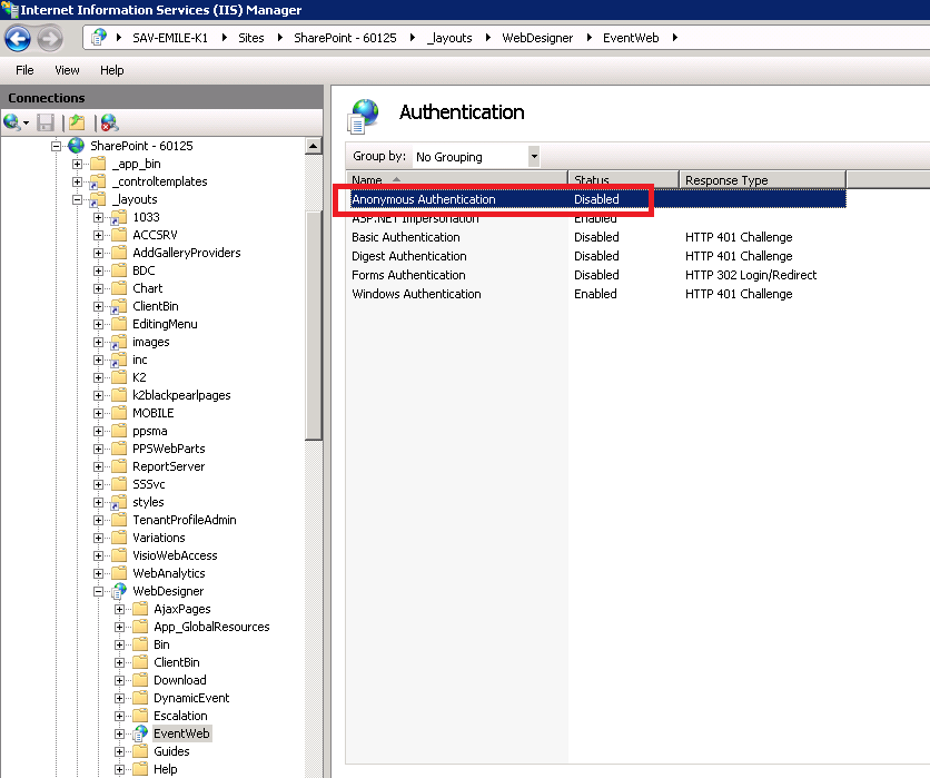 When the Nintex K2 for SharePoint feature activation is executed the virtual directories for WebDesigner and EventWeb are created under layouts/WebDesigner/EventWeb. If Anonymous Authentication is allowed on the site level, the WebDesigner and EventWeb directories will inherit these permissions. If the site is a Claims-based Authentication site, having Anonymous Authentication enabled will cause issues when connecting to the server. Anonymous Authentication should be set to disabled for WebDesigner and EventWeb directories in this case.