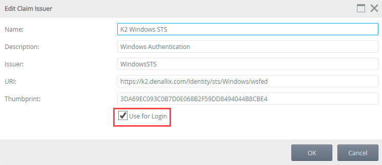 - On the Edit Claim Issuer screen ensure the Use For Login is selected.