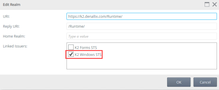 - On the Edit Realm page, select the K2 Windows STS option and click OK.