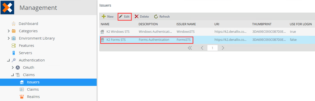 - Open the Management site, and expand Authentication > Claims >Issuers.