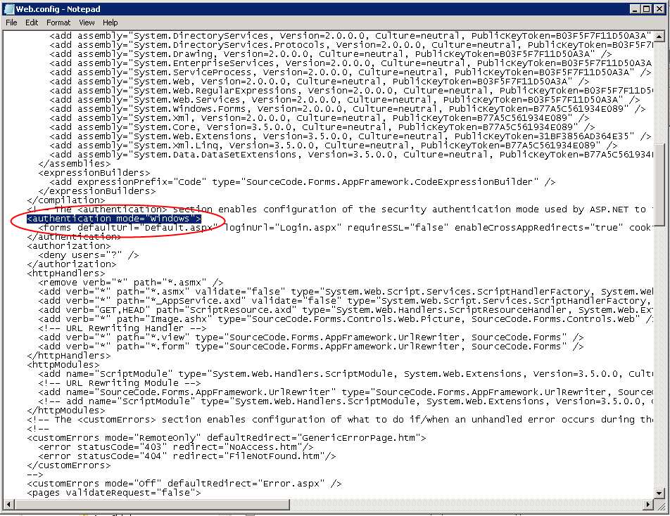 In the web.config file search for “windowsAuthentication enabled”. Change the windowsAuthentication enabled from “true” to “false”.