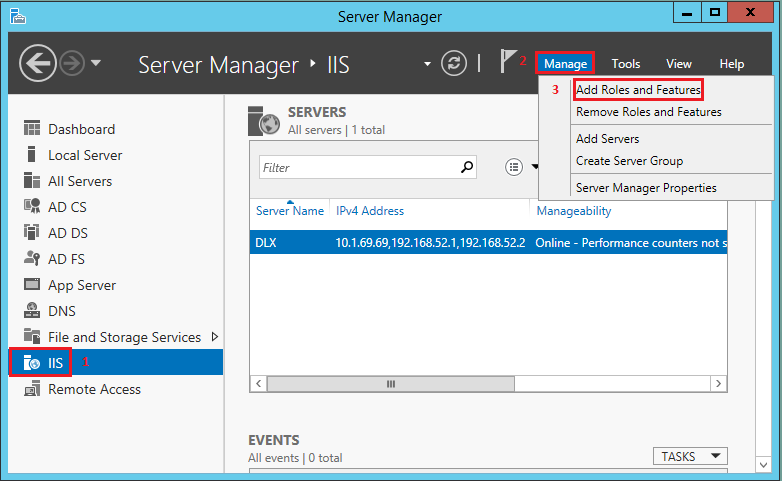 2. Click on the IIS node >Manage > Add Roles and Features.