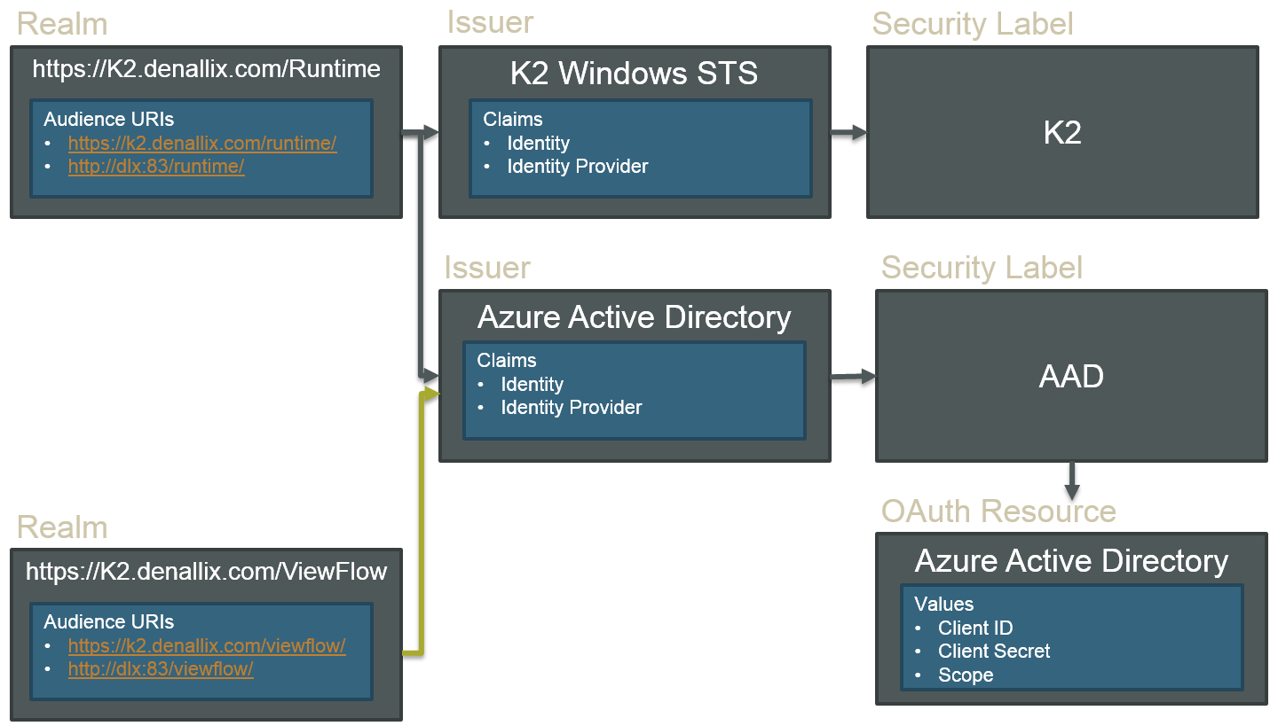 Not all Identity Providers issue claims based security tokens today. Most notably is Active Directory which issues Windows Authentication tokens. To solve this problem K2 has provided a Security Token Service (STS) that converts Windows tokens into claims, known as the Windows STS. Similarly, since Forms Authentication also does not issue claims a Forms STS has also been provided. Systems like Active Directory Federation Services (AD FS) and Azure Active Directory (AAD) issue claims through their own STSs.