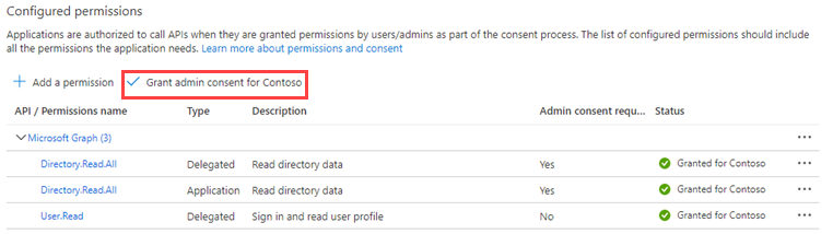 Add the following permissions in the Application Permissions and the Delegated Permissions sections:Permission name Type Description Admin consent required Directory.Read.All Application Read directory data Yes Directory.Read.All Delegated Read directory data Yes User.Read Delegated Sign in and read user profile No - Grant admin consent on behalf of all users in the directory by clicking Grant admin consent for <directory name> and then Yes on the query.