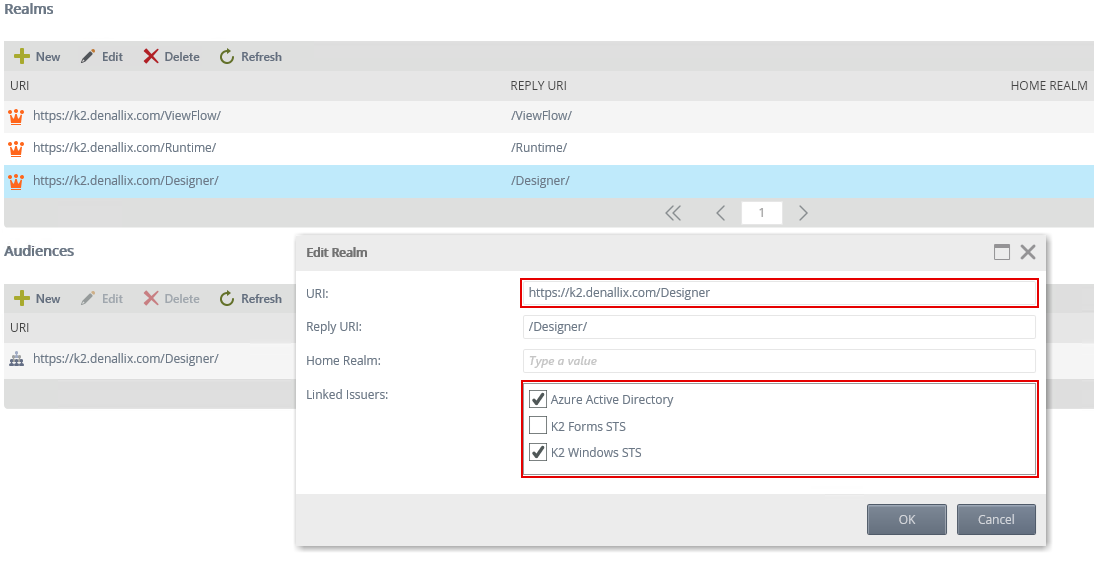 The realm is the unique value that associates the K2 site with the claims authentication options. Audience URIs are the actual URLs that you use to access the K2 site. You can specify extra Audience URIs for a single Realm. For example, if you use https://k2.denallix.com/Runtime and http://dlx:82/Runtime to access the same underlying site, you need both URLs registered as Audience URIs.Realms must exactly match your identifier URIs that you added to the Azure app's manifest without trailing slashes. Do not remove the trailing slashes under Reply URIto avoid redirect loops.Link each realm to your AAD issuer by following these steps:- Open Management and expand Authentication>Claims>Realms.