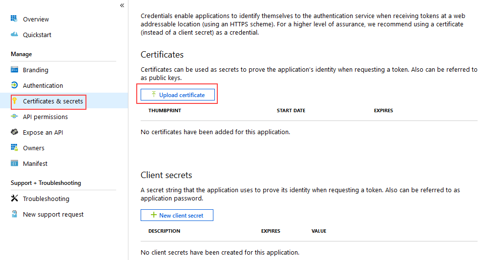 - In Azure Portal, click Certificates & secrets under the Manage menu for your app.
