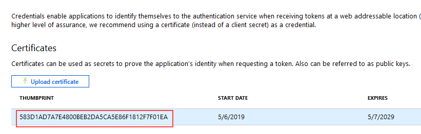 The Certificates section is updated with your key. - Copy the Thumbprint as you will need it in later steps.