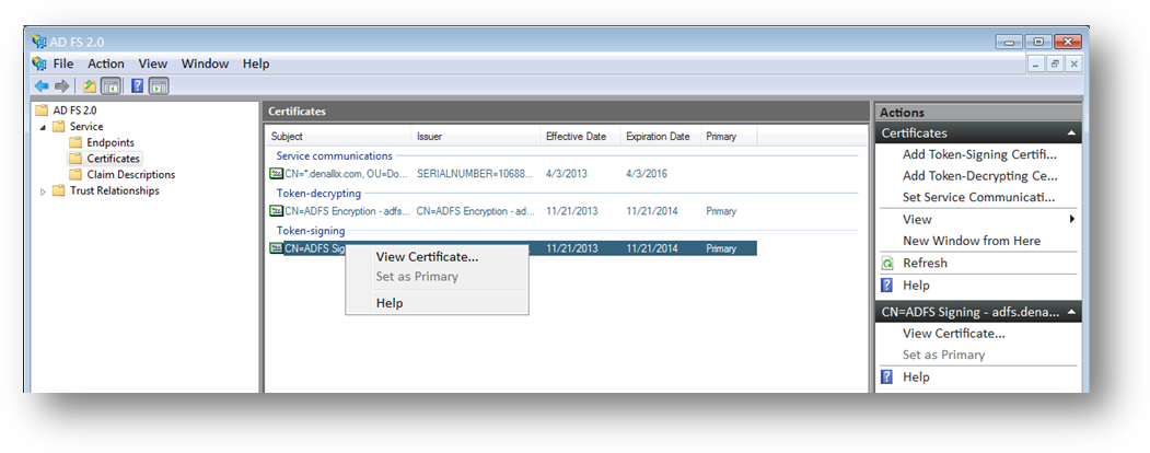 When working with systems like AD FS that are internal to the organization, Self-signed and Domain Certificates can work in place of purchased certificates. If you plan to also integrate with an online system like Azure Active Directory you will need to use a purchased certificate.