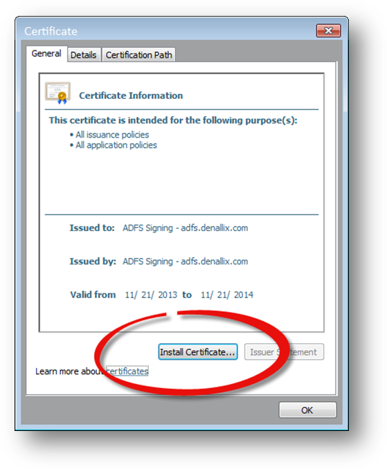 - On the product server double-click the .CER file and click Install Certificate on the General Tab.