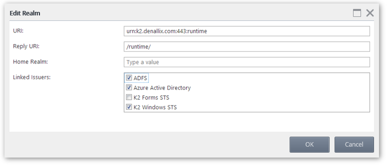 The Realm is the unique value that associates the SmartForms site with the claims authentication options. Audience URIs are the actual URLs that will be used to access the SmartForms site. Additional Audience URIs can be specified for a single Realm. For example if you use https://k2.denallix.com/Runtime and http://dlx:81/Runtime to access the SmartForms site you will need both URLs registered as Audience URIs.