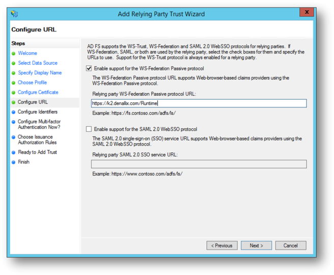 - Enter the SmartForms site URL (Example: https://k2.denallix.com/Runtime/) for the site for which you are configuring the Relying Party Trust, and click Next.