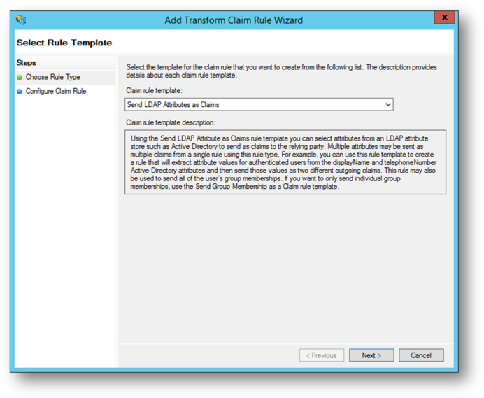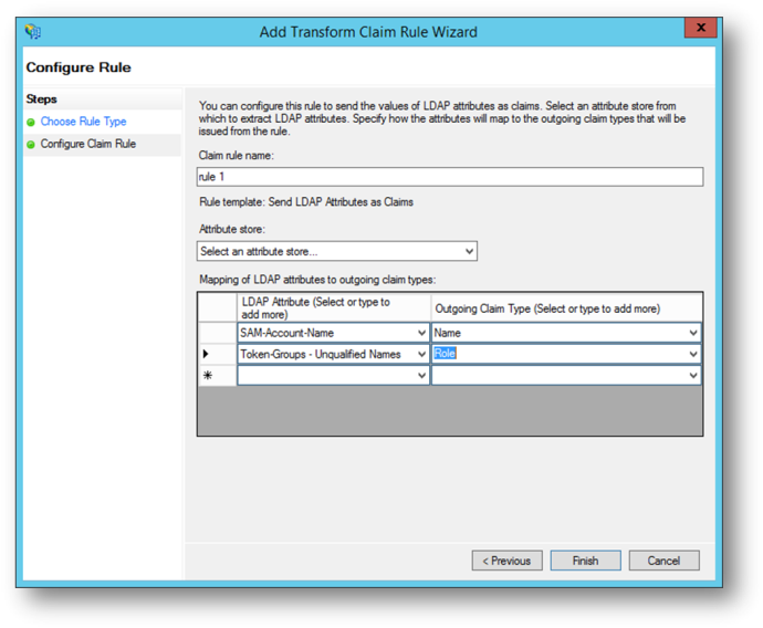 - Supply a name for the rule and select Active Directory as the Attribute store.
