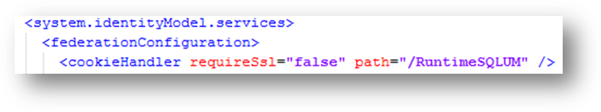 - For the cookieHandler property set the path value to be the same as the Reply URI you configured above but without the trailing slash (example: /RuntimeSQLUM) or set it to the current working directory by using just a slash (example: path="/").