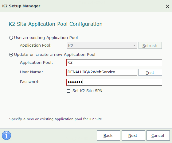 - Provide a user account. K2 recommends using the K2 Server service account.