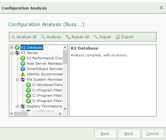 2. You use the Start Menu to run the Configuration Analysis tool from the K2 folder (you do not need specific user rights to run the tool from the desktop).