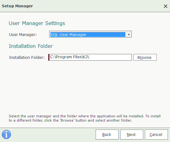 The most common method of installing and using SQLUM is with the Setup Manager. If you are installing the product in an Active Directory environment, SQLUM will be installed automatically as well and you will not see any options in the installer that relate to SQLUM. If an Active Directory domain is not detected during installation (such as in the case of a workgroup server not joined to a domain), SQL User Manager is the only choice for User Manager and you will see it listed on the following page in the installer, as shown here: