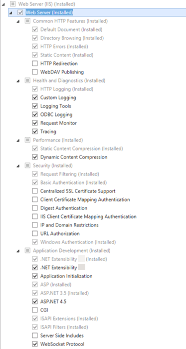5. Enable the features mentioned above. Note that the image below represents an environment where all settings and features have not yet been enabled. See .Net Framework Compatibility.