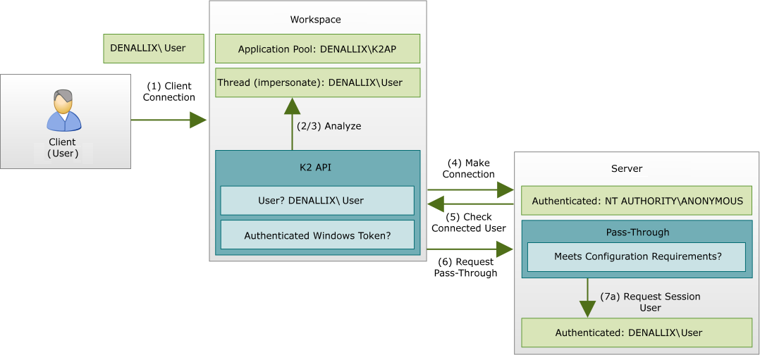 The manner in which Pass-Through Authentication works can be configured using the DelegationContext node in the AppSettings section of the K2HostServer.exe.Config file found in the "%PROGRAMFILES%\K2\HostServer\Bin\" folder. The two options for this setting are ClientKerberos and ClientWindows. This setting is global for all server connections regardless of the source. If a network load balancer (NLB) is in place, all server nodes should have the same setting to prevent inconsistent behavior.