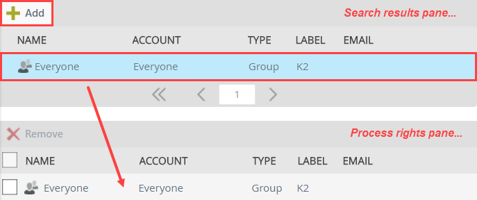 Breaking down this step. First, you search for the user, group, or role you want to assign permissions to. Your search results appear in the first pane, the search results pane. In some cases, you may have more than one result returned. You then select the result you want, then click Add once again to add it to the process rights pane, or list of users you are granting rights to. The Everyone group includes all authenticated users from all associated systems (such as SP, CRM, AD, AAD).