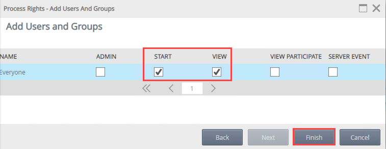 - CHECK the boxes for START and VIEW, then click Finish. Start rights allows you to start an instance of a workflow. View rights allow you to view reports for workflow instances you are associated with.