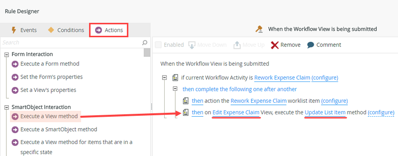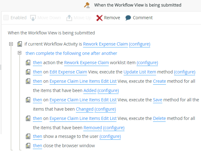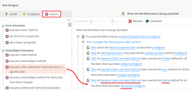 - Add an action to Execute a view method for items that are in a specific state. Configure the action to execute the Delete method of the Expense Claim Line Items Edit List view for all the items that have been Removed. Click (configure).