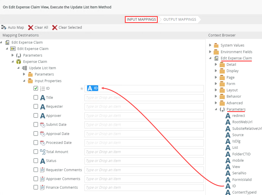 - Input Mappings: Map the Edit Expense Claim form > Parameters > ID to the ID input property. Here, you are mapping the ID of the current record (Parameters > ID) as the ID for the record to update.