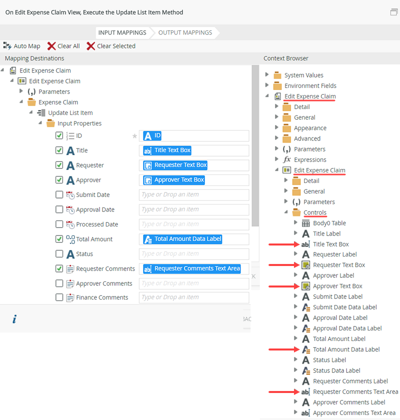 - Map the following controls (from the Edit Expense Claim view) to the input properties: Title Text Box, Requester Text Box, Approver Text Box, Requester Comments Text Area, and Total Amount Data Label. Here, you are mapping the form fields to their respective SmartObject properties.