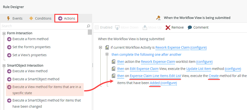 - Add an action to Execute a View method for items that are in a specific state. Configure the action to execute the Create method of the Expense Claim Line Items Edit List view for all the items that have been Added. Click (configure). Here, you are creating a new child record in the SmartObject for each new item the originator adds.