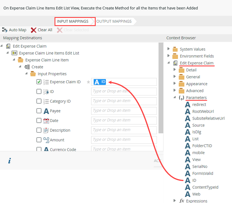 - On the Input Mappings screen, expand the Edit Expense Claim node in the Context Browser, then expand the Parameters node. Map the Parameters > ID to the Expense Claim ID input property. Once again, you are linking the new child record(s) with the parent record via the ID.