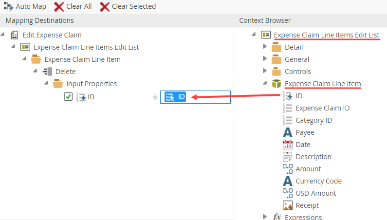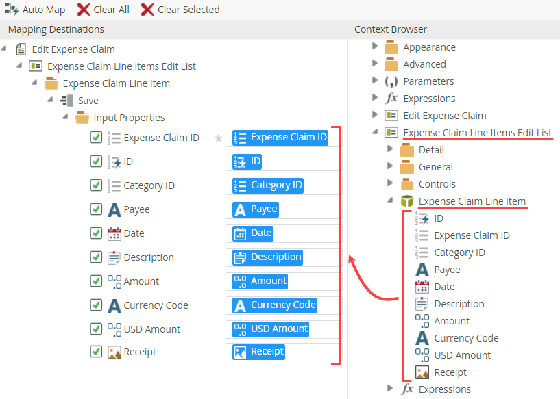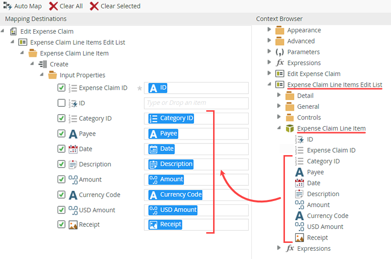 - Map the Expense Claim Line Items Edit List > Expense Claim Line Item SmartObject properties to the input mappings.