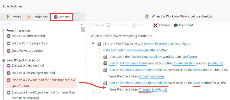 - Add an action to Execute a View method for items that are in a specific state. Configure the action to execute the Save method of the Expense Claim Line Items Edit List view for all the items that have been Changed. (In Nintex K2, save is the equivalent of update.) Here, you are updating existing child records with any changes made by the originator. Click (configure).
