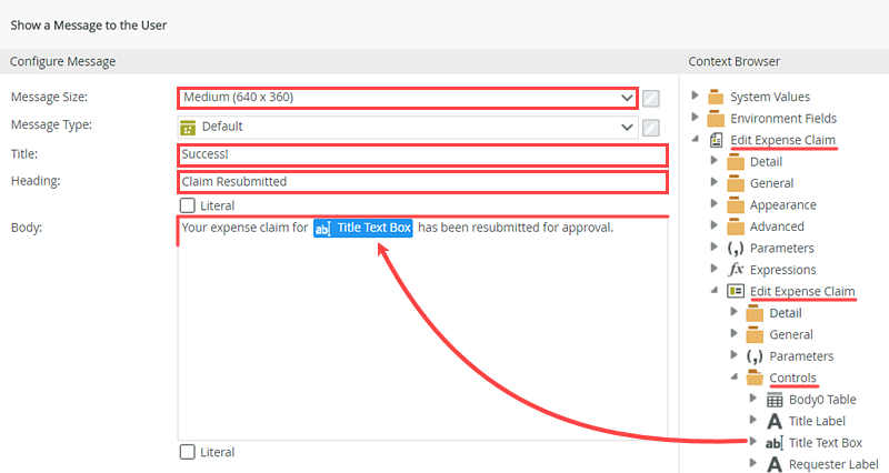 - Add an action to show a message indicating the claim has been resubmitted. Use the images below as a guide, if necessary. Click OK to continue.