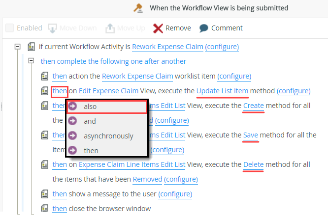 In the rule definition pane, find the then on Edit Expense Claim view, execute the Update List Item method action. Click then and change it to also.