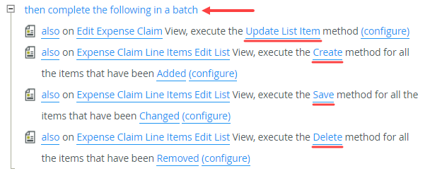 - Repeat the step above for the Create, Save and Delete actions, so that they run in a batch. The four actions now run in a single batch action.