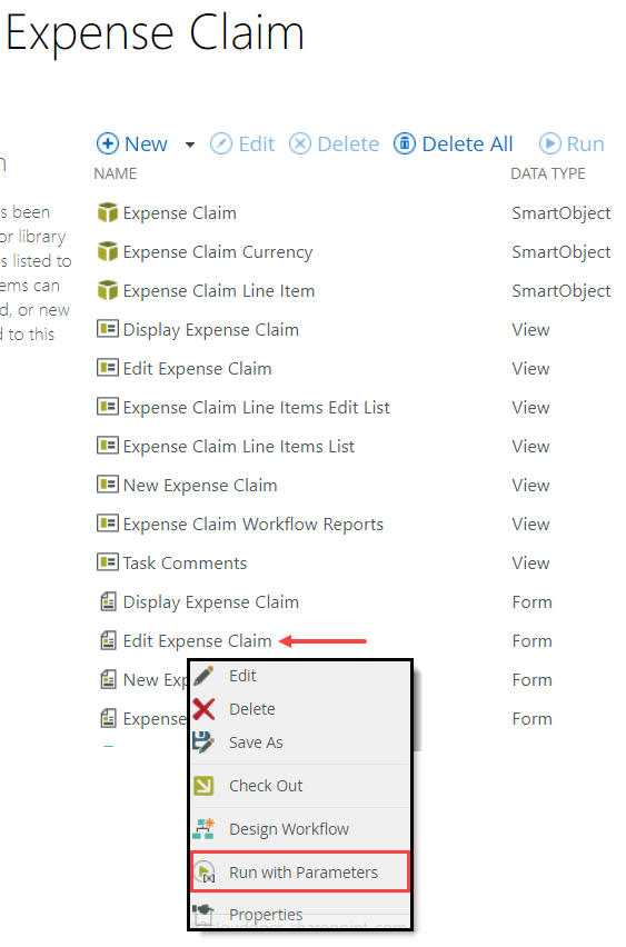 - On the K2 Application elements page, right-click the Edit Expense Claim form and select Run with Parameters. You add the Expense Claim list item ID for an item added earlier. Because you are not opening the parent form first, Nintex K2 doesn't know which parent or child records to retrieve so you must provide the parent ID for testing.
