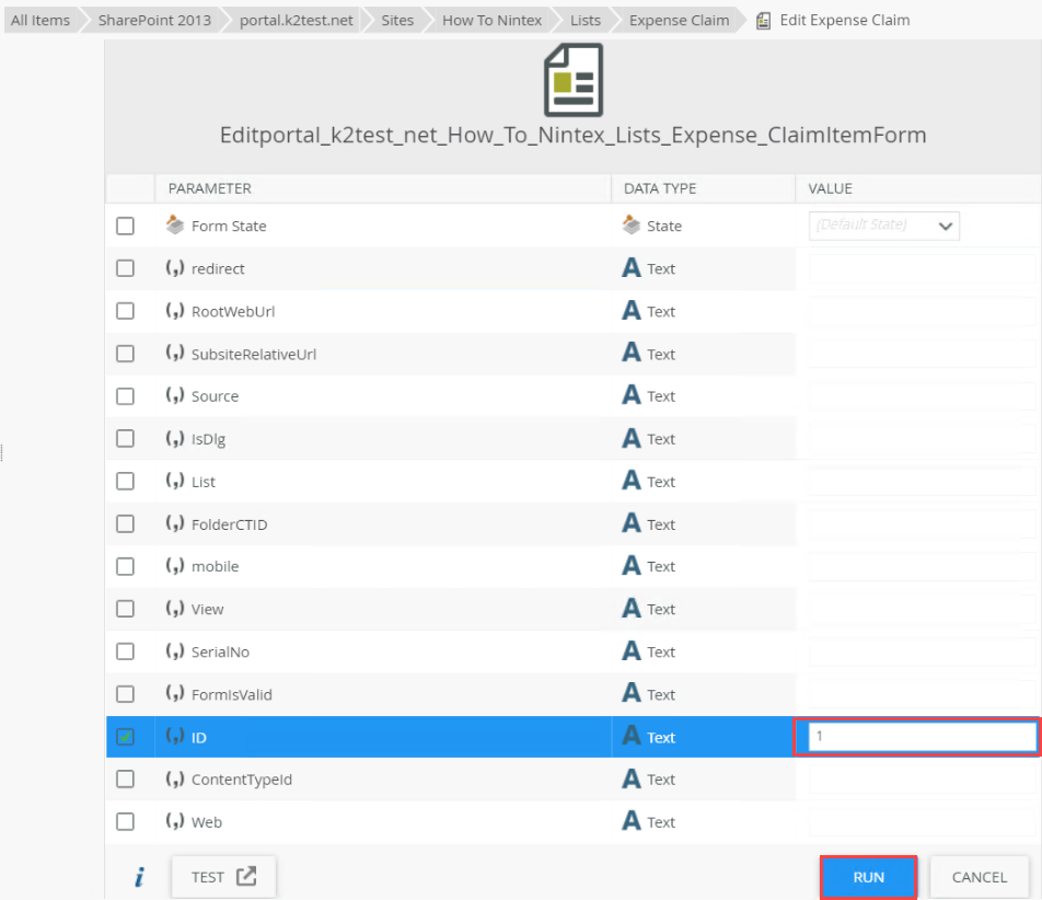 - On the parameters screen, provide a value for the ID parameter, then click Run. The ID value "1" is most likely the first test item added to the Expense Claim list, but you can try sequential numbers if the edit form does not show any data.