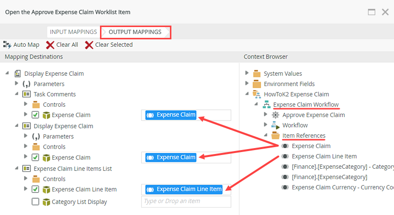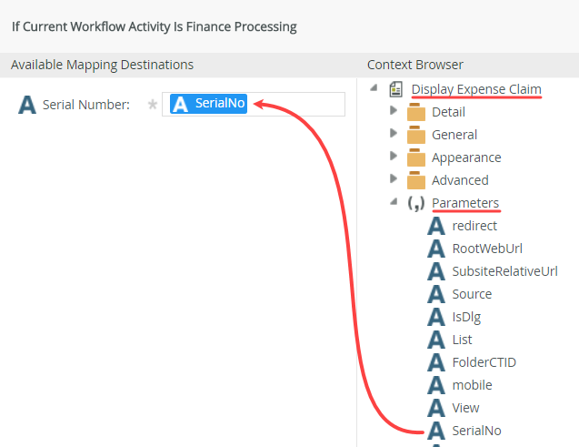 - Repeat the steps above for the Finance Processing worklist item action. Confirm the Serial Number contains the SerialNo parameter. Confirm the item references (Expense Claim and Expense Claim Line Item) are mapped to their respective views. If not, map the references.