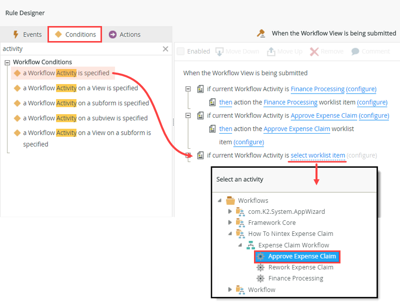- With the Conditions tab active, click a Workflow Activity is specified to add it to the rule definition pane. Use the select worklist item link to select the Approve Expense Claim activity. If the condition is true, you are on the Approve Expense Claim step and can add actions specific to that step. In this case, saving the approver comments to the SmartObject.