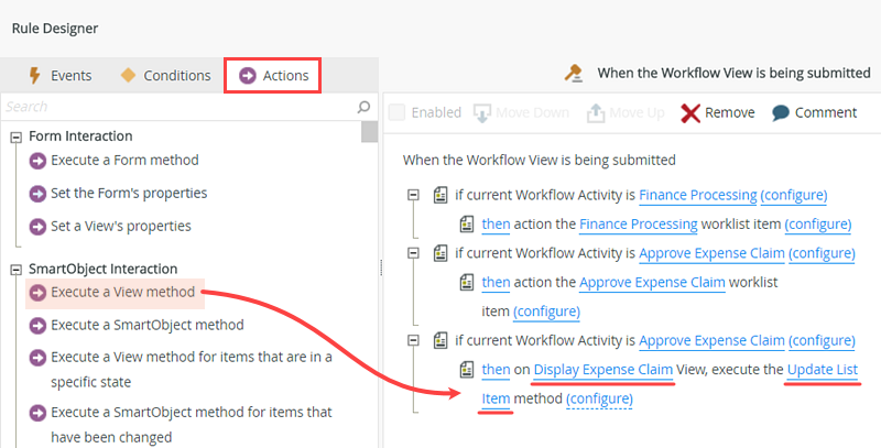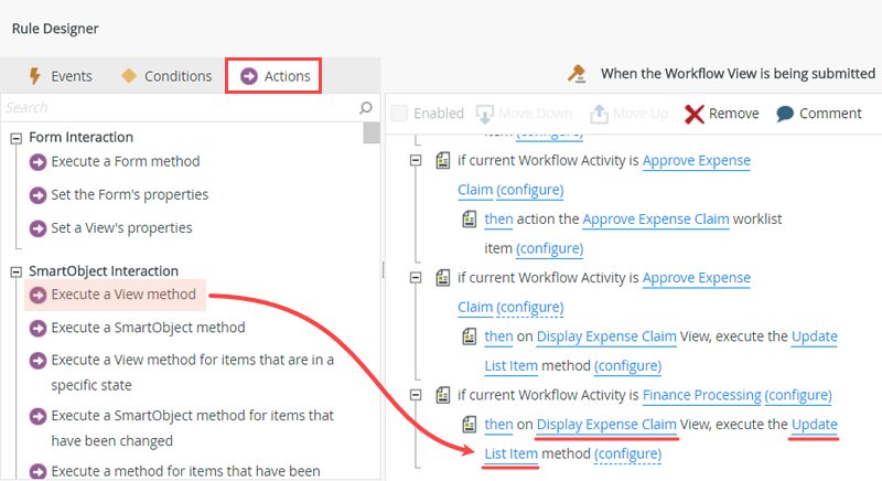 - With the Actions tab active, click Execute A View method. Configure the method to call the Update List Item method of the Display Expense Claim view. Click (configure).