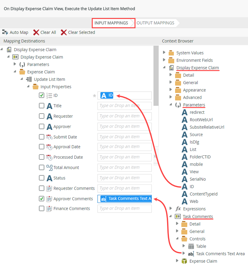 - Execute a View method. Configure the action to call the Update List Item method of the Display Expense Claim view. Map the Task Comments Text Area to the Approver Comments input property. Map the Parameter ID to the ID input property (so that the product knows which record to update).