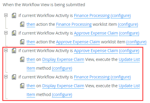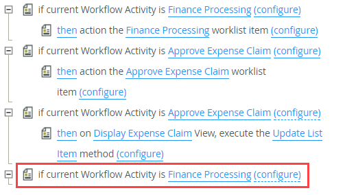 - Locate the if current Workflow Activity is Approve Expense Claim condition. Locate the action that says then open the Approve Expense Claim worklist item. Click (configure).