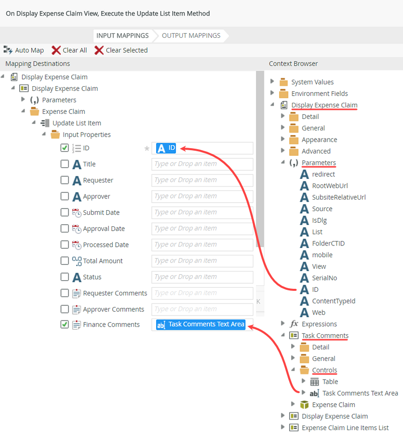 - Execute a View method. Configure the action to call the Update List Item method of the Display Expense Claim view. Map the Task Comments Text Area to the Finance Comments input property. Map the ParameterID to the ID input property (so that Nintex K2 knows which record to update).
