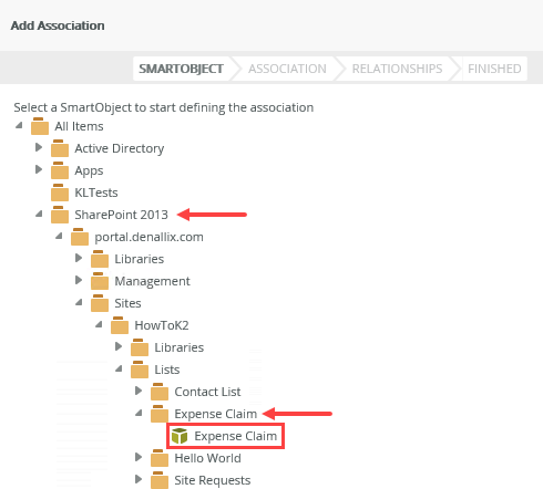 - On the Add Association screen, navigate to the Expense Claim SmartObject. Your screen may be different than the image below, depending on your SharePoint names and subsite structure. Click NEXT.