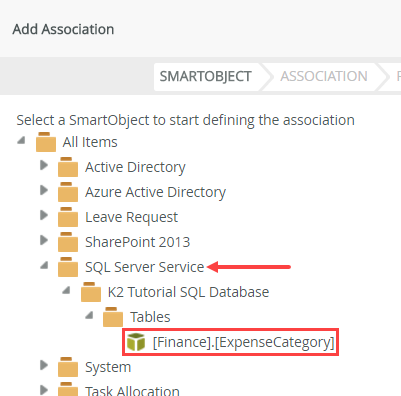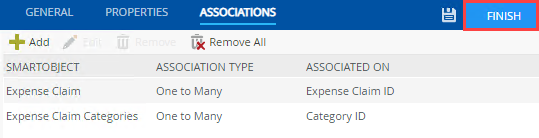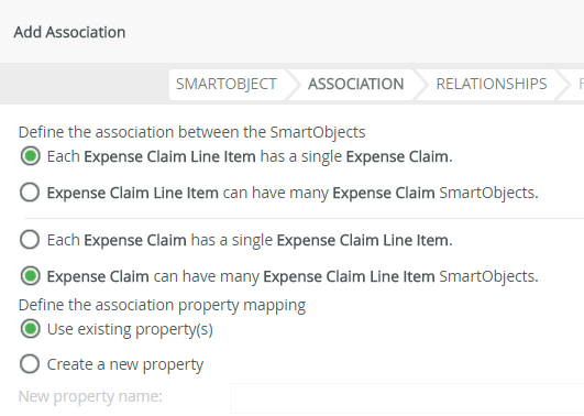 Associated SmartObject Association Property Mappings Expense Claim Each Expense Claim Line Item has a single Expense Claim and an Expense Claim can have many Expense Claim Line Items. Expense Claim Line Item. Expense Claim Id = Expense Claim.ID [Finance].[ExpenseCategory] Each Expense Claim Line Item has a single [Finance].[ExpenseCategory] and a [Finance].[ExpenseCategory] can have many Expense Claim Line Items. Expense Claim Line Item. Category Id= [Finance].[ExpenseCategory].ExpenseCategoryId - Click the ASSOCIATIONS tab in the toolbar. You associate the Expense Claim Line Item (Smartbox) SmartObject with the Expense Claim SmartObject (generated from the SharePoint Expense Claim list).SmartObject associations create a relationship between two SmartObject data sources. Like a SQL JOIN statement, you associate SmartObjects by mapping common properties. For example, an ID property. Associating SmartObjects creates a parent - child model. In this step, the parent is the Expense Claim (or "header") SmartObject, generated from the Expense Claim list. The child is the Expense Claim Line Item SmartObject (or "details"). You have one parent record with one or more child records (associated with the parent).