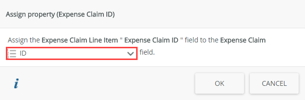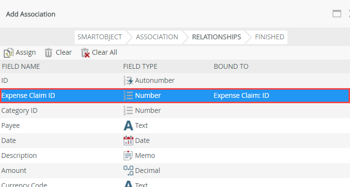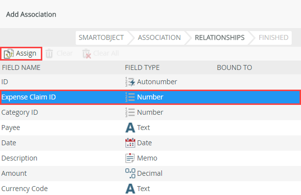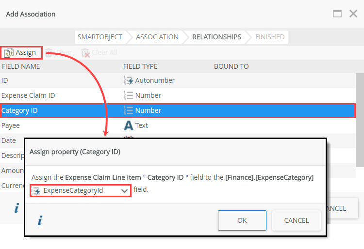 - Next, you define which properties form the link between the two data sources. Select the Expense Claim ID property and click Assign. You map the Expense Claim ID property (from the Expense Claim Line Item SmartObject) to the ID property (from the Expense Claim SmartObject).