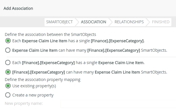 - Configure the association so that each Expense Claim Line Item has a single [Finance].[ExpenseCategory] and a [Finance].[ExpenseCategory] can have many Expense Claim Line Item SmartObjects. Select the Use Existing Property radio button to define the property mapping. Click NEXT. Once again, each line item record has a single category, while each category may have many line item records.
