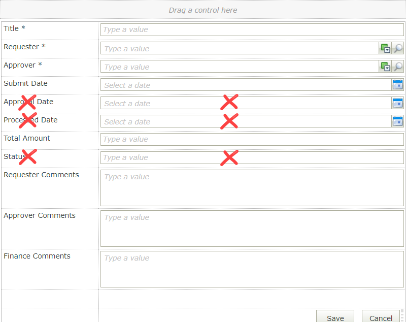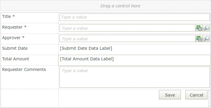 - Remove the Approver Comments, Finance Comments, Approval Date, Processed Date, and Status labels and controls. Remove the resulting empty rows. You see a dependencies warning. Change the option to Remove all dependencies. Change the Submit Date and Total Amount controls to Data Label controls. The updated view should look like the image below.